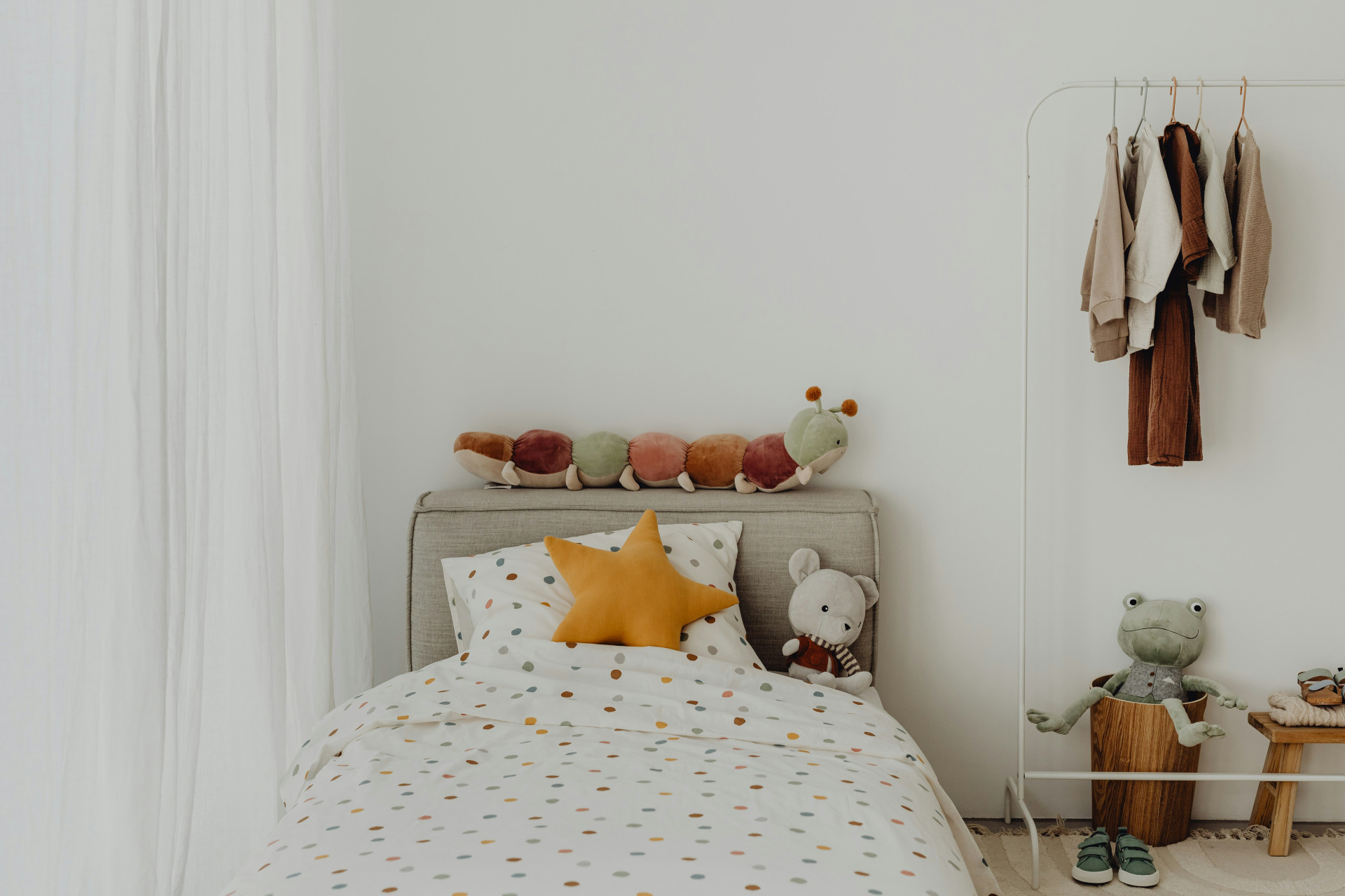 Selvom basen er neutral, kan du skabe personlighed gennem tekstiler, billeder og små detaljer. Gardiner, sengetøj, puder og plakater kan nemt udskiftes, når barnet får nye yndlingsfarver eller interesser. Det er en enkel måde at forny rummet på uden at male eller købe nye møbler.